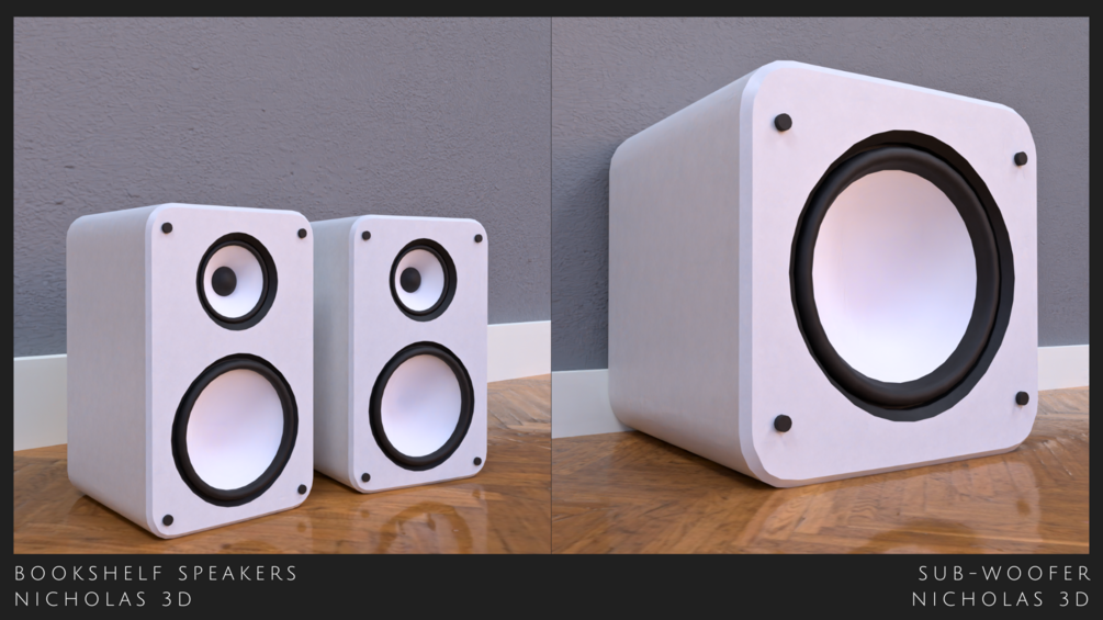 Complete your entertainment scenes with this high-quality 3D Home Theater Speaker System. The pack includes a variety of speaker types tower speakers, bookshelf speakers, satellite speakers, center channel, and a subwoofer – designed with realistic proportions and clean details to enhance any interior setup.